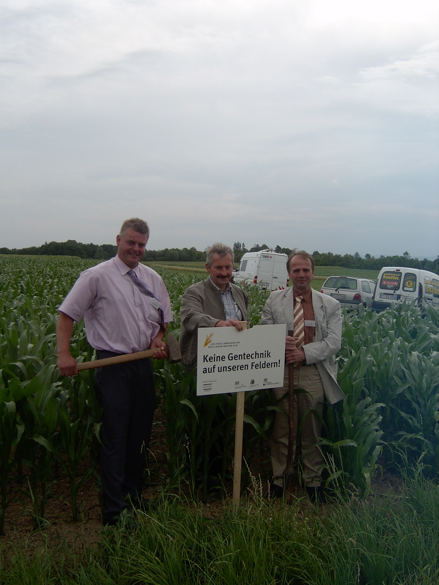 Hochaufgelöstes Pressefoto zur Auftaktveranstaltung - von links nach rechts: Alexander Schäfer (KBV Zollern-Alb) Gebhard Aierstock (KBV Reutlingen) und Christian Reutter (KBV Tübingen)) setzen den Grundstein für Deutschlands größte gentechnikfreie Anbauregion Reutlingen/ Neckar-Alb (Abdruck bitte mit Quellenangabe) [pressefoto_auftaktveranstaltung.jpg] (893 kB, jpg-Datei, 01.07.2004)