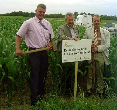 Alexander Schäfer (Kreisbauernverband Zollern-Alb) Gebhard Aierstock (KBV Reutlingen) und Christian Reutter (KBV Tübingen) setzten am 01.07.04 den Grundstein für Schwabens größte gentechnikfreie Anbauregion Reutlingen / Neckar-Alb.